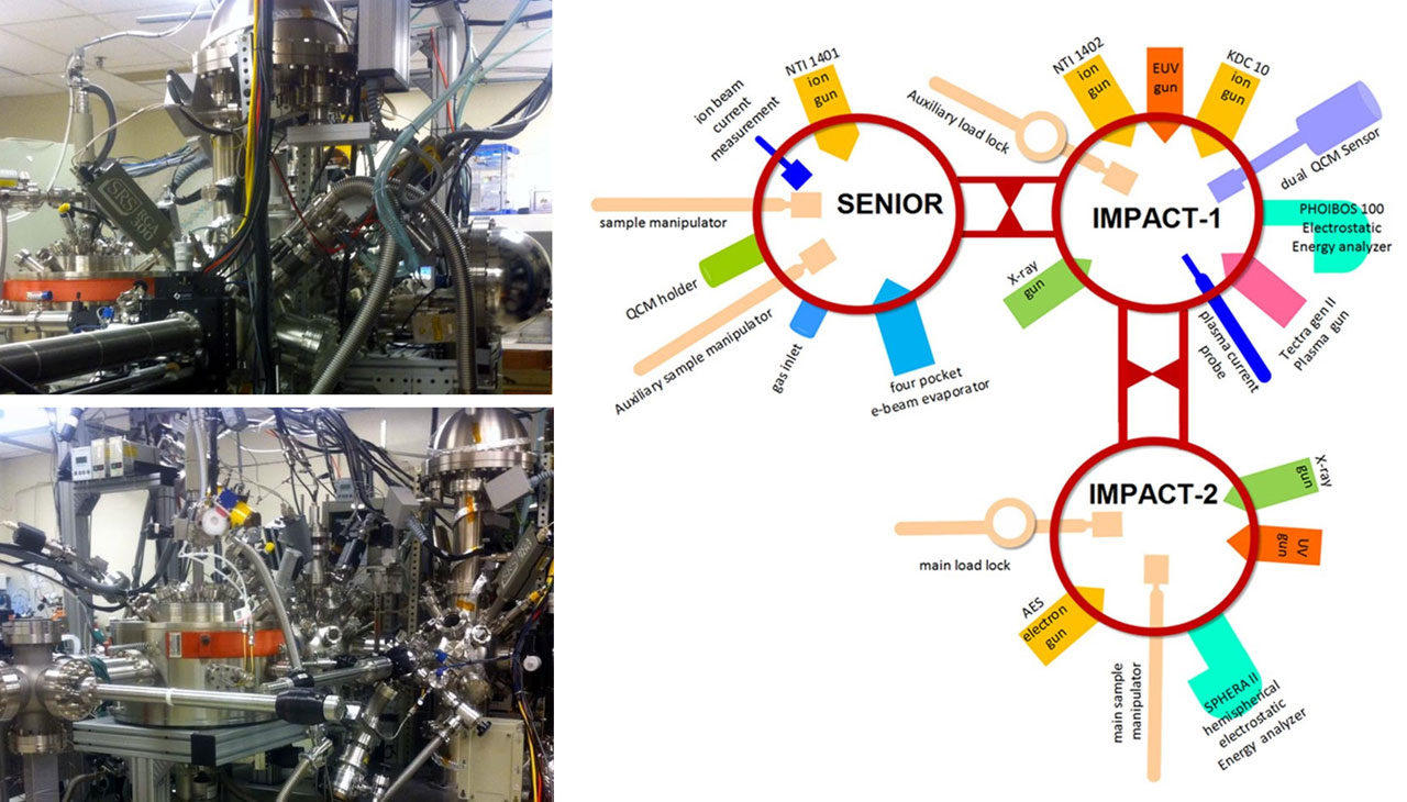 Ultrahigh vacuum chambers, Inert gas ion sources, E-beam evaporator, Dual anode X-ray source (Specs GmbH, Model XR50), EUV source (13.5 nm, Phoenix Model sem20), Electron gun,